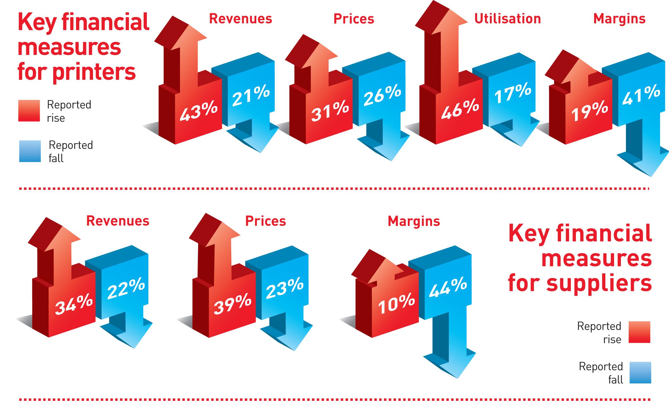 Afbeelding: De belangrijke prestatie-indicatoren van drukker (boven, vlnr: omzet, prijzen, bezettingsgraad en marges) en leveranciers (onder, vlnr: omzet, prijzen en marge). Rood geeft groei aan, blauw een daling.