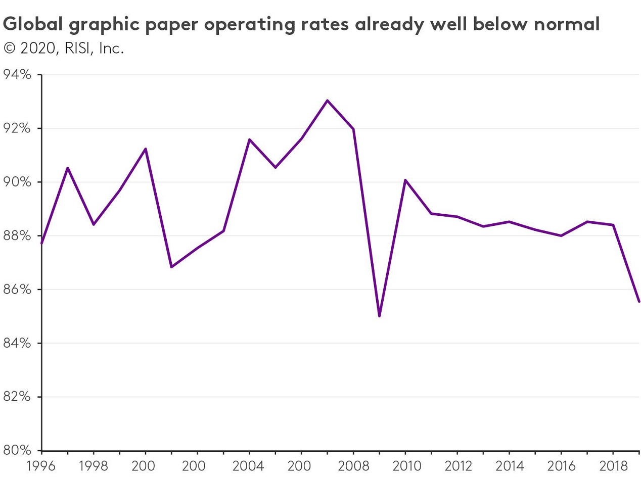 Het vooruitzicht van een langdurige sterk verzwakte vraag naar grafisch papier als gevolg van de coronacrisis komt bovenop een toch al moeizaam 2019: de wereldwijde vraag naar grafisch papier daalde vorig jaar met 5% naar 6,0 miljoen ton, terwijl de wereldwijde capaciteitsvermindering slechts 2,7 miljoen ton bedroeg. De bezettingsgraad bij grafisch papier daalde hierdoor in 2019 al naar 85,6%, het op één na laagste niveau ooit (2009 was nog slechter).