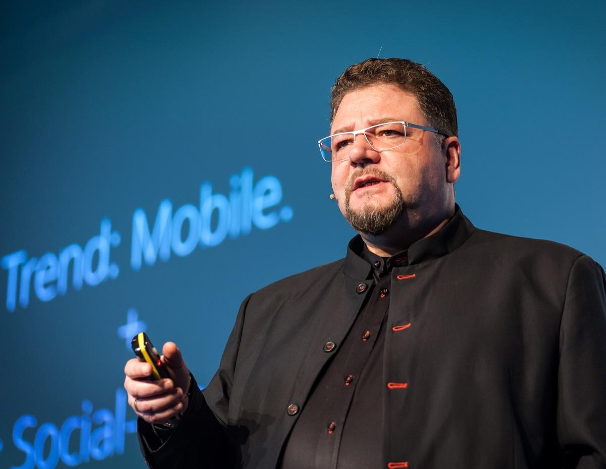 Drukkers kunnen zich niet meer veroorloven om klantgroepen als smartphonegebruikers te negeren, stelde Bernd Zipper in zijn trendlezing over Online Print. 'Iedere smartphonegebruiker heeft de potentie om met een drukker in contact te treden.'  Fotocredit: #OPS2020