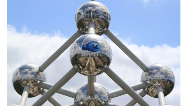 Op één van de bollen van het Atomium in Brussel prijkt tot eind december een enorm zelfklevend smurfenhoofd…